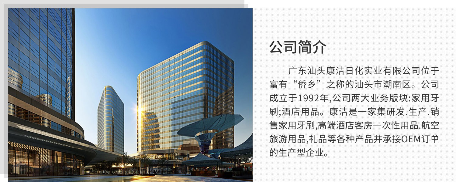 • 汕頭康潔日化實業(yè)有限公司是一家集研發(fā).生產(chǎn).銷售高端酒店客房一次性用品等各種產(chǎn)品并承接OEM訂單的生產(chǎn)型企業(yè)。